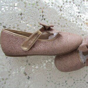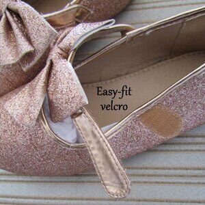These lovely shoes sparkle in all types of light -- just not much in my pictures. Your little girl will love to wear these for any number of occasions, such as Christmas programs, birthday parties, dance recitals, costume events, parades, plays, pageants, or dress-up. These have an easily-adjustable velcro strap, non-skid soles, and nicely-rounded toes for comfort. The color is a rose gold.