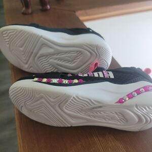 Step into style and comfort with these **Custom Bling Pink Puma Slip-Ons**! Perfect for the fashion-forward liitle girl on the go, these shoes boast a vibrant pink hue adorned with eye-catching bling that adds a touch of sparkle to any outfit. Crafted for convenience, they feature an easy slip-on design that makes getting ready a breeze. Previously loved yet in excellent condition, these Pumas promise both durability and flair. Don't miss out on the chance to make these dazzling sneakers a standout piece in her wardrobe!👸🎀👸🎀