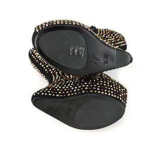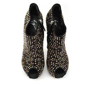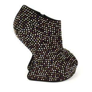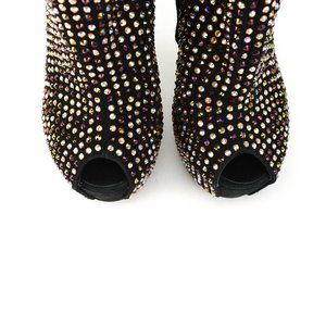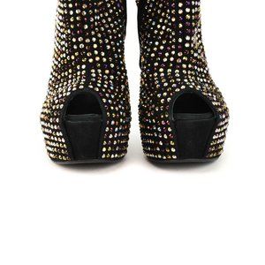 Black suede leather peep-toe platform ankle boots/booties with signature "Heel-Less" design accented by multicolor Swarovski Crystals throughout