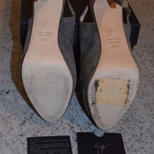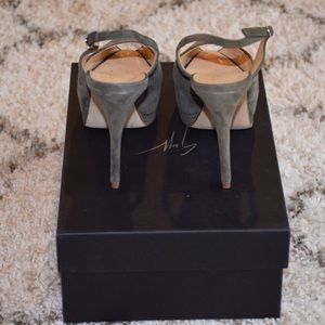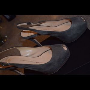 GIUSEPPE ZANOTTI "Caky" suede peep toe sling back pump. Platform gray/green color. 6" covered heel; 2" platform; 4" equiv. Lightly cushioned footbed. Super comfy!