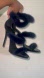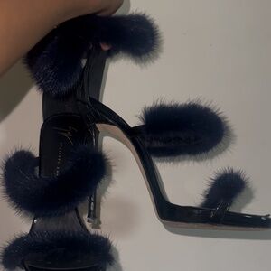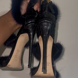 These were worn once, are in great condition, the fur is a dark blue, not black. the back of the heel is black crocodile material. Rare heel. Love them but they are too small/narrow. RUNS SMALL.