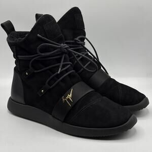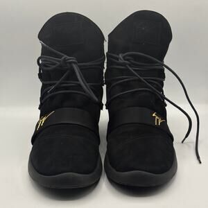 Step into luxury streetwear with these Giuseppe Zanotti high-top sneakers. Crafted from premium black suede and leather, these designer kicks feature a modern lace-up silhouette with a bold strap detail and signature gold Giuseppe Zanotti logo hardware. The plush interior lining ensures maximum comfort, while the sleek, sculpted sole offers a fashion-forward edge. These statement sneakers are perfect for elevating your street style game — ideal for pairing with joggers, slim-fit denim, or an urban monochrome look.