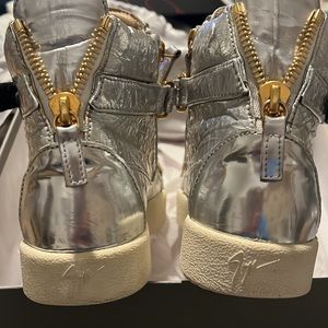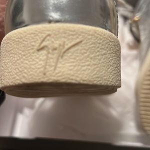 GIUSEPPE ZANOTTI SZ 38 1/2. Like a size 8. Very good condition. AUTHENTIC. Comes with dust bag. Has the box but torn on the corners. Has yellow marks on the lining. Haven’t tried to take it off. zippers are a little hard to zip from not enough use but they zip perfect. Make an offer