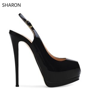 Gorgeous GIUSEPPE ZANOTTI peep-toe platform slingback pumps. Sharon style in Black Patent.