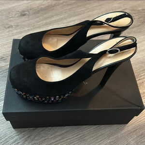 Gorgeous colorful rhinestones on platform with genuine butter soft suede. Slingback design. Perfect for a party or special event. They match everything 😍.