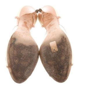 Ivory patent leather Giuseppe Zanotti d'Orsay pumps with silver-tone hardware, crystal embellishments at vamps, tan leather trim and covered heels.