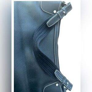 This elegant black calfskin leather bag is perfect for any occasion. Its sleek design and high-quality material make it a must-have accessory. The bag features stylish stitching and practical front pockets for added convenience. It is very clean all the way around and big enough to carry everything you need. Hardware is silver and logo’d and the strap is a super durable cotton.