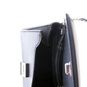Black leather Givenchy Micro Pandora Box bag with silver-tone hardware, single chain-link shoulder strap, chain-link embellishments throughout, tonal suede lining, single interior slit pocket and push-lock closure at front flap. Similar model (but not as expensive as this model) Great condition with some minor signs of wear. Includes dust bag