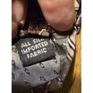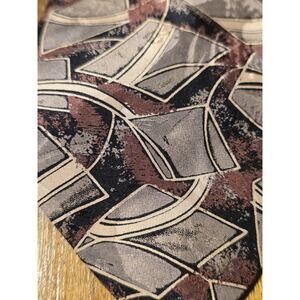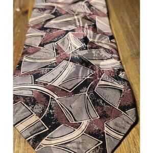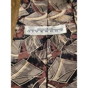 This product is a vintage Givenchy Monsieur men's silk tie in beige, red, and black colors with a geometric design. The tie is 100% silk and made in the United States. It features a classic length of 57"-60" and a classic width, making it a timeless and stylish accessory for men who appreciate high-quality and unique pieces.
