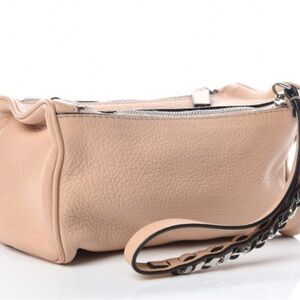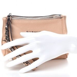 This is an authentic GIVENCHY Sugar Goatskin Pandora Wristlet in Old Pink. This bag is composed of beautifully surfaced goatskin leather in nude. It features a leather wrist strap embellished with silver chain. There is a facing zipper and a top zipper that open to a compact beige fabric interior. This is an ideal wristlet for any occasion with the classic chic of Givenchy!