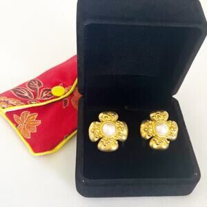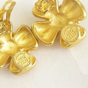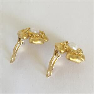GIVENCHY Vintage Floral Button Gold Toned Faux Pearl Earrings Clip On