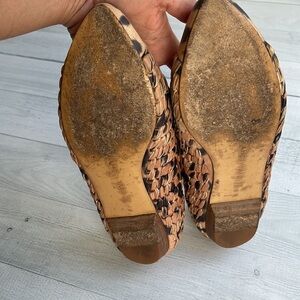 Beautiful Givenchy Woven Leather Leopard Print Flats Size 5. Tan and black leather Givenchy flats with pointed-toe, braided accents at sides, leopard print throughout, and stacked heels.