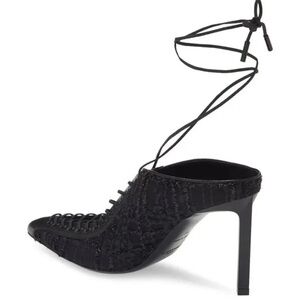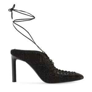 -details: The classic pointy-toe black pump is revamped for the season with a textured knit upper, elastic lace-up straps and a sculptural heel. 4" (102mm) heel. Wraparound ankle strap with tie closure Textile and leather upper/leather lining and sole.