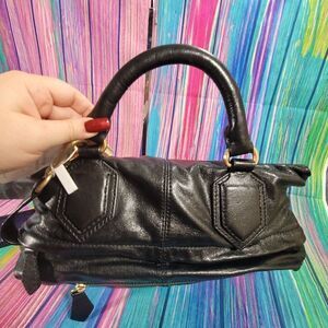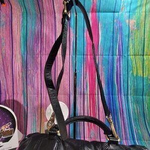 This chic messenger bag is finely crafted of smooth calfskin leather in black. The bag features external front zipper pockets, a rolled leather top handle, and an optional leather body strap with a Givenchy Paris logo across and polished silver hardware. The top zipper opens to a fabric interior with a zipper and patch pockets. This is an excellent bag, ideal for everyday essentials. SIZE IS APPROXIMATE Base Length: 13.25 in Height: 9.75 in Width: 4.75 in Drop: 4.25 in Drop: 14.25 in Designer ID#: SI0151 Year: 2011