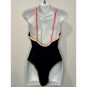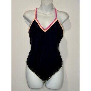 GIanni Bini Black with Neon Multicolor Crochet Trim One Piece Swimsuit Sz L NWT!