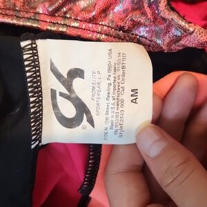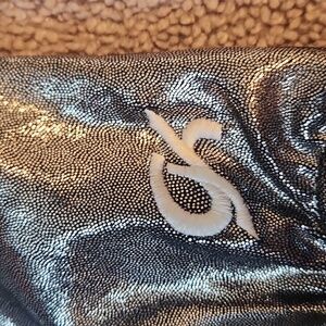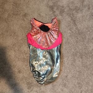 Vibrant sleeveless gymnastics suit with a metallic finish. Features pink, silver, and multicolor patterns.
