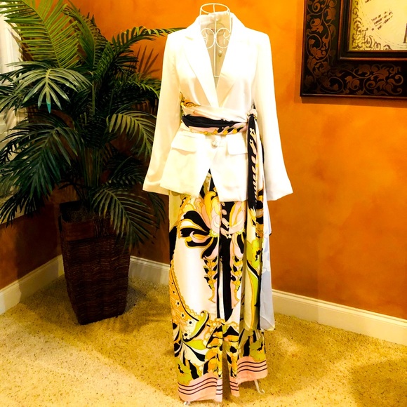 This suit says it all! Boss chic all day long! One button blazer with a paisley sash and matching pants, side zipper