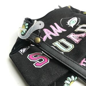 Super fun graphics of diamonds, lipsticks, eyes, and more. Colorful on a black ground.