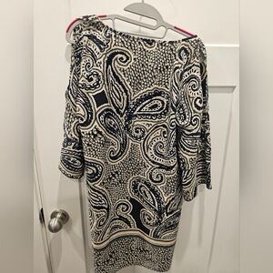 glam dress, paisley print tunic, boho mini dress, black beige print, 3/4 sleeve blouse dress, stretch polyester dress, casual tunic, medium shift dress, bohemian chic, lightweight travel dress