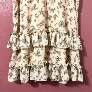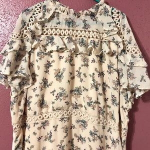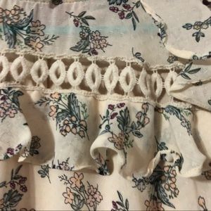*features a midi length, ruffled details, a high neck, crochet details, and a hidden back zipper