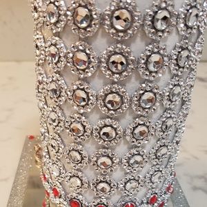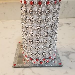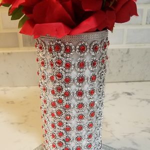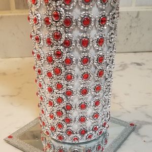 Tall 7" inch glass vase to hold your beautiful flowers. Sits on a mirrored square stand with silver glittered border. Red rhinstones that sits within silver-tone embellishments. FLOWERS NOT INCLUDED. Washable only within
