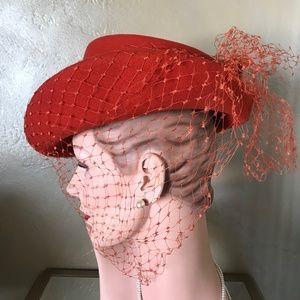 This glamorous vintage orange felt fedora consists of a tall uneven crown indented at the top and surrounded by an upturned medium wired brim edged in grosgrain. There is also a matching orange grosgrain band around the crown. The stunning matching long & short feathers match the hat and give it a striking look. The feathers are attached to the hat on the side, piercing an intricate 'knitted looking" circle as shown on the photos. The look is finished with a matching intact veil, which can be tucked inside the brim, or worn covering the face as pictured.