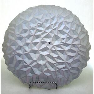 Pretty glass centerpiece dish. This is a 12.5" glass dish that has a mosaic look to it. The back is a solid silver color. The front is a turquoise green with gold & brown "grout" lines. There is a clear acrylic feel finish on the front. It is a pretty plate for display. I do not know if it is food safe.