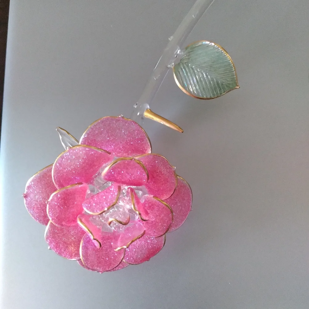 pink and green gold trimmed glass rose. preowned. thorns and leaves and rose has glitter. 8". abt 2 oz.