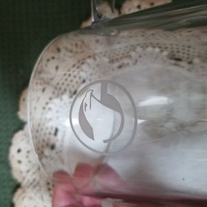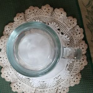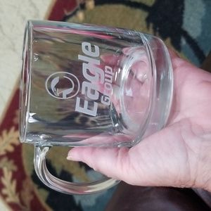 Clear glass mug "Eagle Group" etched on one side and an eagles head on the other. Great for hot or cold liquids. 3.25" diameter 3.75" tall