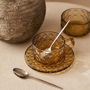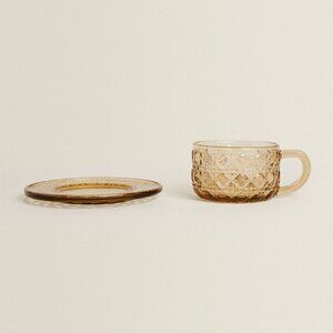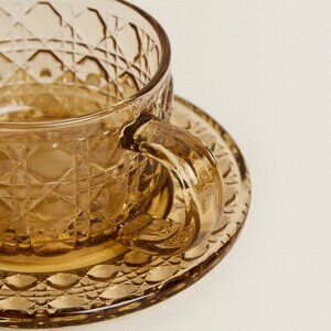 GLASS TEACUP AND SAUCER WITH RAISED GEOMETRIC DESIGN