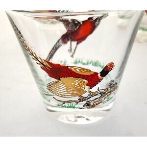 Nice set of mid-century modern designed Old Fashion glasses. These glasses appear to be from Libbey, but are unmarked. They are a clear glass. Each glass has a painted red and gold pheasant. One side is the pheasant on the ground the other side is the bird with open wings. I've looked them over and I don't think there is hardly, if any, wear on the paint. The paint design is not solid, however, it appears to be the original way they were painted and look to be in very good condition. Each glass holds 3/4 cup fluid. Great addition to any bar or glass collection. This is a set of 4 glasses.