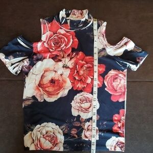Glaze USA cold shoulder bodycon top in a vibrant floral print on a black background. Stunning addition to your wardrobe. Excellent condition. Polyester & Spandex. Size S