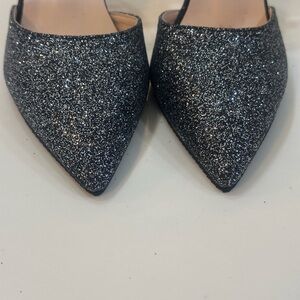 Step out in style with these comfortable black pointed toe glitter heels. At 3 1/2”L they are not too high and not too low. The square heel tips make them steady on soft surfaces. Perfect for any occasion, these shoes add a touch of sparkle to your outfit. Carefully packed and ready to send your way.
