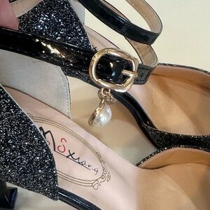GLITTER - Black Glitter Women's 3 1/2”L Heels with Ankle Strap and Pearl Charm Size 7 NWOT