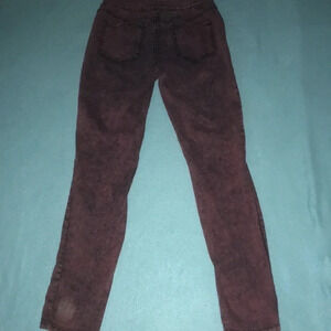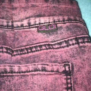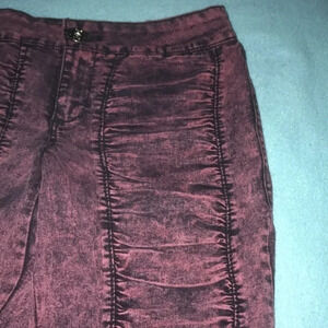 Very cute pleated detail down front of legs with black threads, purplish pink color, 2 back pockets, 8 inch low rise. Stretchy