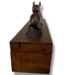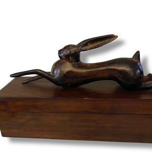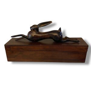 The box is made of rosewood with a patinated metal or bronze rabbit sculpture on the lid.