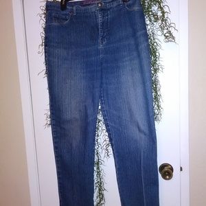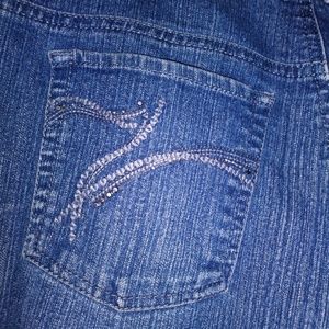 Blue stretch denim jeans feature a classic high-rise fit with a straight leg cut. Made from soft, durable denim, they offer both comfort and timeless style. The design features decorative stitching on the back pockets making them a classic piece for any casual or semi-dressy outfits.
