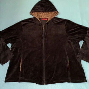 GLORIA VANDERBILT SPORT velour velvety soft zip up drawstring hoodie, 2 pockets, long sleeve, silky cheetah print in hood and pockets, cozy loose fit