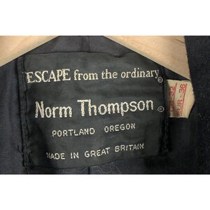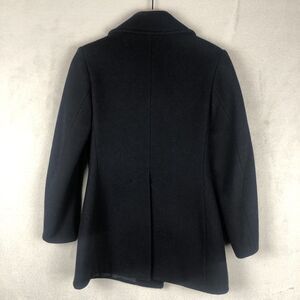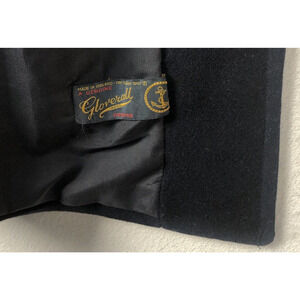 This classic black Gloverall Norm Thompson peacoat is made of wool tweed, and features a double-breasted button closure and a mid-length design. It is lined with polyester. The coat has a chest size of 34 inches (size tag: EU 36, GB 32), and suitable for various occasions. Made in London, United Kingdom, it is ideal for winter, fall, and spring seasons.