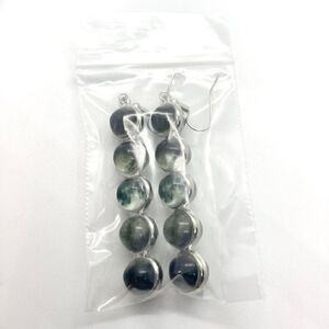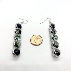 Dangle glass dome moon earrings. Each sphere are different phases of the moon: waxing crescent, waxing gibbous, full moon, waning gibbous, waning crescent. These earrings glow in the dark after charging in direct light. See photo (sorry it's blurry, but you can clearly see the blue/green glow!) Made of glass and silver tone aluminum alloy; they do have a bit of weight to them. They measure approx 3“ from the top of the earring hardware to the bottom of the last sphere.