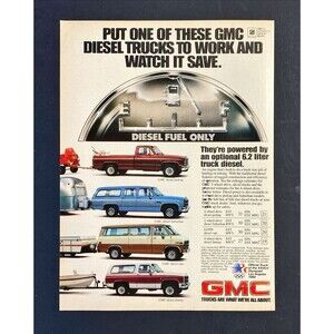 GMC Diesel Trucks "Jimmy-Van-Suburban & Pickup Trucks" Vintage Print Ad 1982 Car & Driver Magazine October 1982 About 11 x 8 Inches. Carefully shipped.