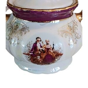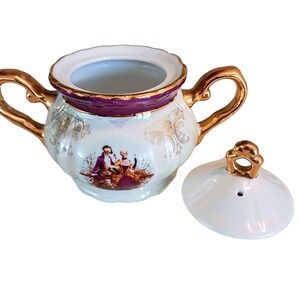 GNA Fine Porcelain Sugar Bowl Container w Lid 24k Hand Painted Victorian Romantic Couple Iridescent Crimped Scalloped Ornate Gold Hollywood Regency 24K Gold Gilding 2 Handles, Vintage Antique