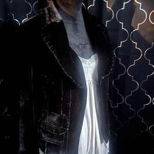 Luxurious black velvet blazer with ruffle details. Perfect for elegant occasions.