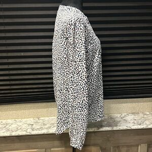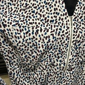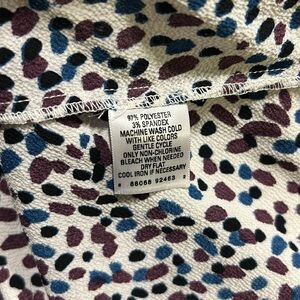 GNW women’s long sleeve collarless blouse. 1/2 zip front. Chest pockets. Button cuffs. White with blue and maroon speckles. Polyester/ spandex blend. Size medium
