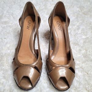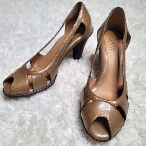 These are a pair of GNW heels that feature a shiny Champaign Taupe color, peep-toe, cut-out sides, and a 3" heel:)