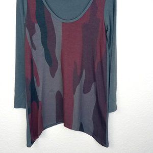 Nordstrom brand Go Couture red and gray camo long sleeve top. Very soft camouflage tunic tee, long sleeves, handkerchief hem, round neck, stretchy material. Best when paired with shorts.