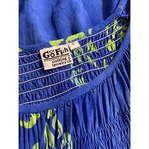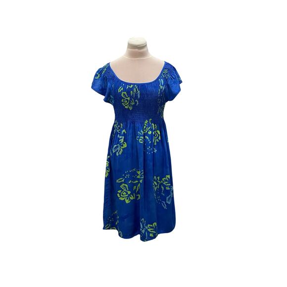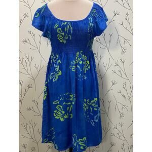 GO FISH Blue Green Tie Dye Batik Hawaiian Smocked Flutter Sleeve Dress SMALL