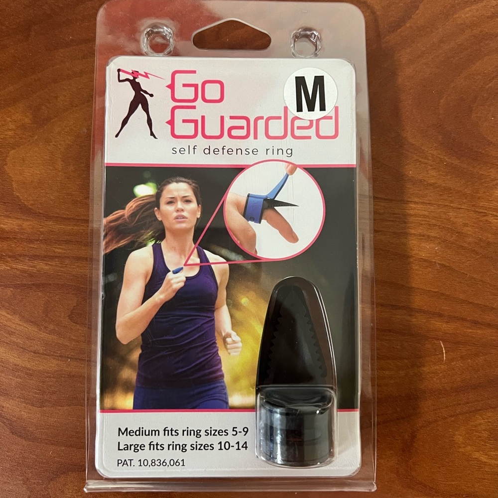Go Guarded ring is a heavy-duty plastic serrated-edge self-defense tool that is worn on any finger. The Medium size fits ring size 5 to 9, the Large size fits ring size 10-14, and each comes with inserts to adjust the size of the ring. When the self-defense ring is used, blade cover will automatically flex out of the way on impact.