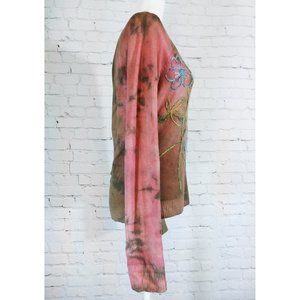 Two-tone Pink/tan/green tie dye with yarn embroidered flowers
