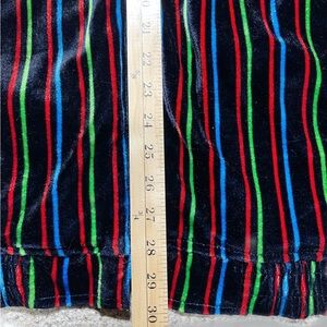 Vibrant velour hoodie with multicolor black, red, green, blue stripes. Features a drawstring hood, and a full zip front with 2 front pockets.